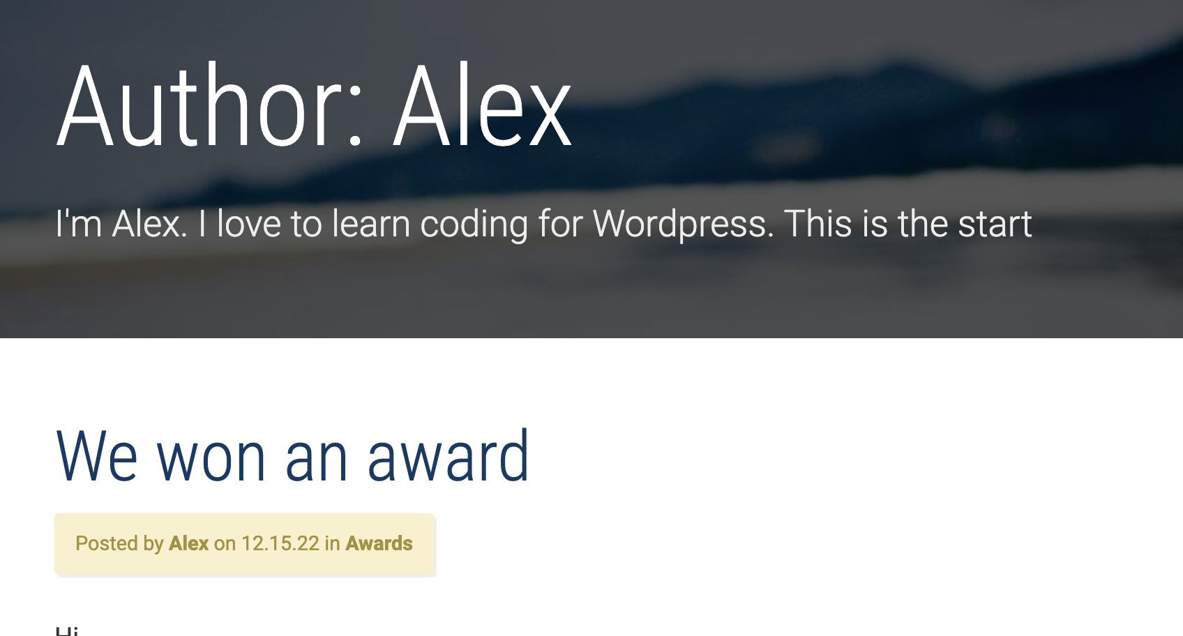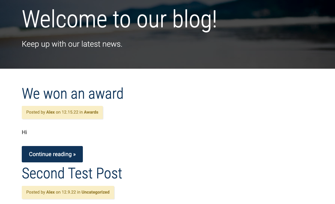 get_header();while(have_posts()) {the_post(); ?>샘플 텍스트 우선 블로그를 위해 페이지 배너 div class를 가지고 옵니다. 다른 페이지에 있는 코드를 복사해 왔습니다. 상단 배너와 사진 그리고 배너 페이지 내용이 보입니다. div class="page-banner"> div class="page-banner__bg-image" style="background-image: url( echo get_theme_file_uri('/images/ocean.jpg') ?>)">div> div class="page-banner__content container container--narrow"> h1 class="page-banner__title"> the_title();..