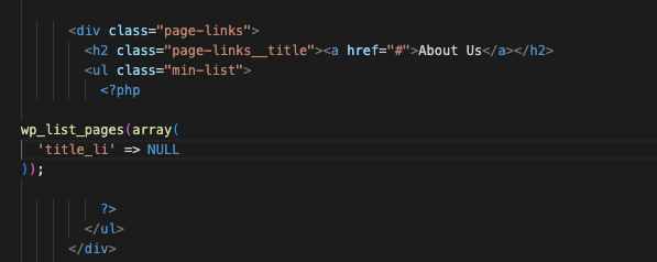 첫 번째로 리스트의 제목인 'page'를 없애기 위해 'title_li' => NULL 을 사용하였습니다.