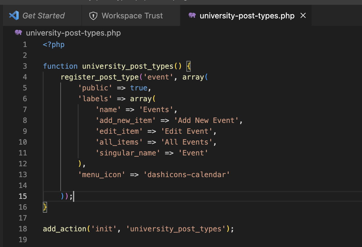 university_post_types() {} 꼬불 괄호 안에 필요한 내용을 모두 입력해 주고 있습니다.